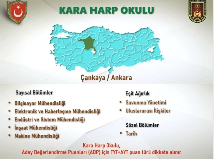 Kara Harp Okulu; Ankara’da eğitim ve öğretime devam etmekte olup eğitim süresi, hazırlık sınıfı dâhil 5 yıldır. Okula, kadın ve erkek öğrenci alınmaktadır.