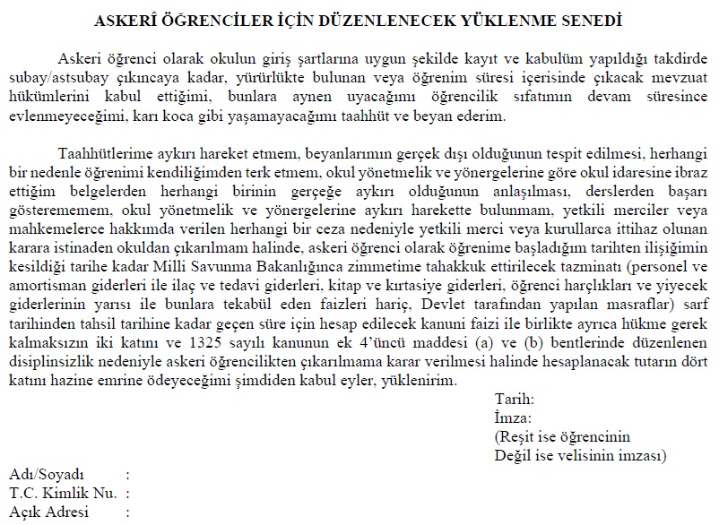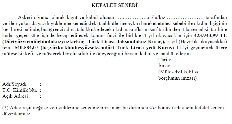 b. Aday reşit değilse veli yüklenme senedine imza atar, bu durumda söz konusu aday için kefalet senedi düzenlenmez.