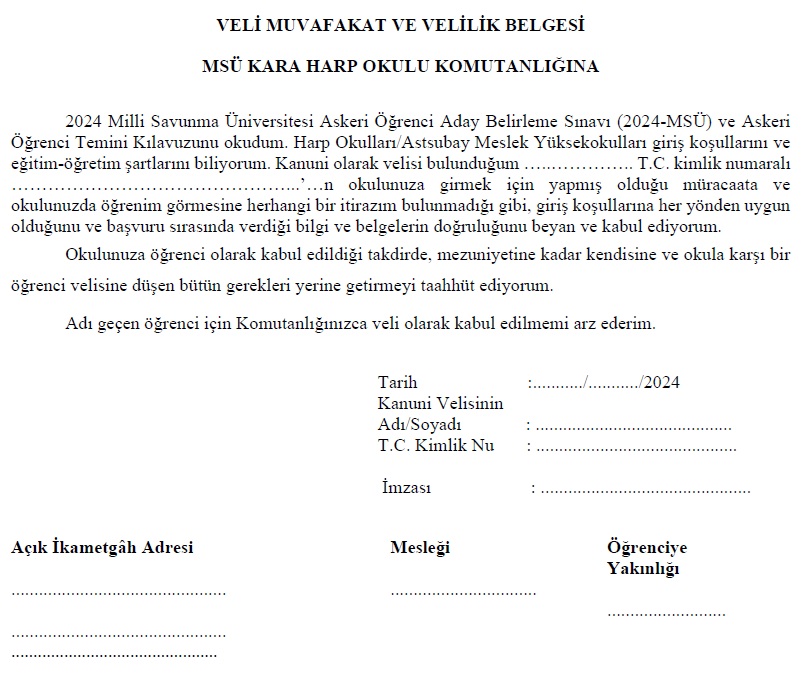7. Veli Muvafakat ve Velilik Belgesi (Sadece 18 yaşından küçük adaylar hazırlayacaktır. NOTER ONAYLI ve 1 suret olacaktır. Örneği aşağıda mevcuttur.)