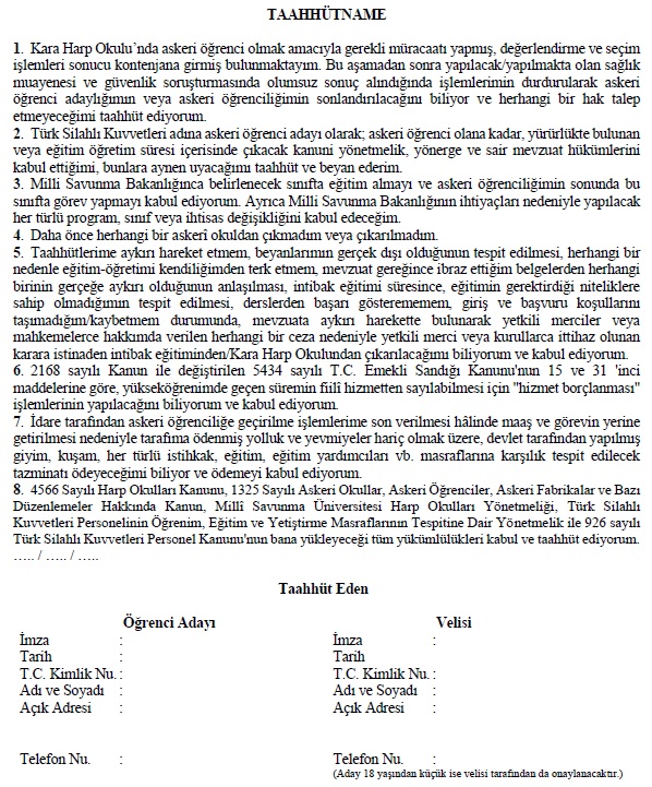 8. Taahhütname (18 yaşından küçük adaylar için velisi tarafından onaylanacak, 18 yaşından büyük adaylar ise kendisi onaylayacak ve 1 suret olacaktır. Örneği aşağıda mevcuttur.).
