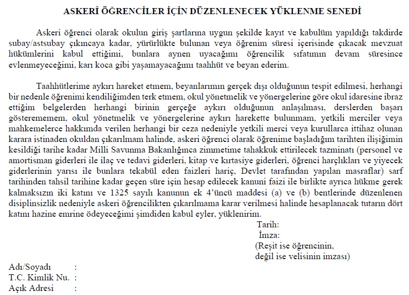 Not-1: İstenilen belgelerde eksiklik ve yanlışlık olduğu takdirde KAYIT YAPILAMAZ. Kendisine verilen kayıt süresi içerisinde belgelerini tamamlayamayan adayların ASKERÎ ÖĞRENCİ ADAYLIKLARI SONLANDIRILIR.