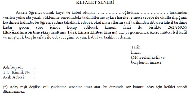 b. Aday reşit değilse veli yüklenme senedine imza atar, bu durumda söz konusu aday için kefalet senedi düzenlenmez.