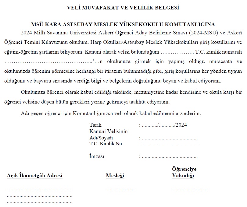 7. Veli Muvafakat ve Velilik Belgesi (Sadece 18 yaşından küçük adaylar hazırlayacaktır. NOTER ONAYLI ve 1 suret olacaktır. Örneği sitede mevcuttur.)