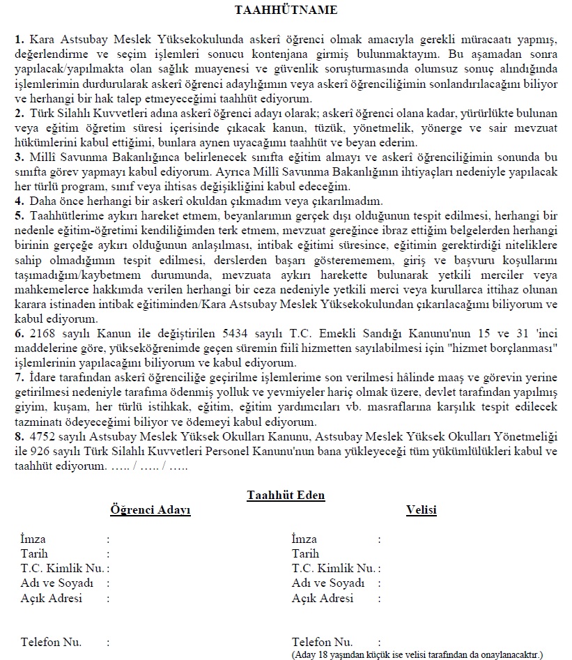 8. Taahhütname (18 yaşından küçük adaylar için velisi tarafından onaylanacak, 18 yaşından büyük adaylar ise kendisi onaylayacak ve 1 suret olacaktır. Örneği sitede mevcuttur.)