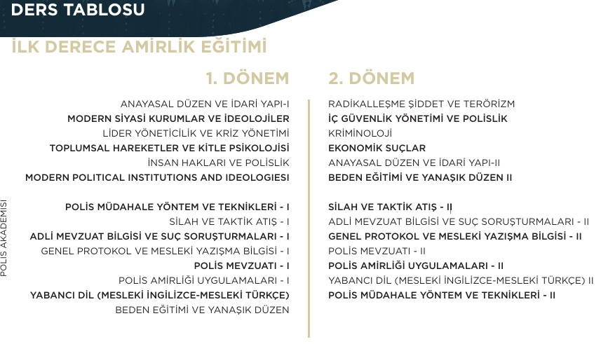 Polis Amirleri Eğitimi Merkezinde eğitim-öğretim gören öğrencilere yönelik akademik takvim ve ders programı doğrultusunda bir yılı yabancı dil hazırlık eğitiminin ardından iki dönem halinde teorik ve uygulamalı eğitim olmak üzere toplam iki yıllık “İlk Derece Amirlik Eğitimi” verilmektedir. Dönem içerisindeki uygulama eksiklerini gidermek, mesleki disiplin ve meslek sevgisini kazandırmak, dönem içerisinde verilen kurumsal eğitimi uygulamaya çevirmek, irade, zor şartlara uyum sağlama, soğukkanlılık, fiziki kondisyon, moral, mesleki bilgi ve becerilerinin artırılması için uygulamalı eğitimler verilmektedir.