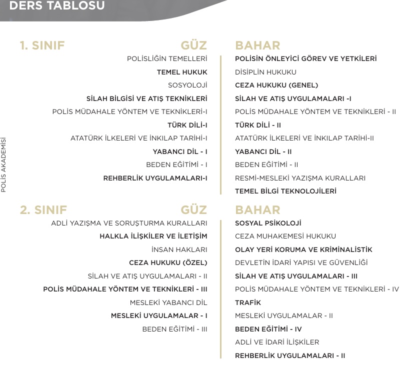 Polis Meslek Yüksekokullarında Eğitim-öğretim süresi 2 yıl (4 dönem) olup, her bir dönem en az 14 haftadan oluşmaktadır. Eğitim programları haftada 26 saat olup, dersler katsayılı ve kredili olarak görülmektedir.” kısmı “Eğitim-öğretim süresi, en çok 1 ay süre ile intibak eğitimin ardından 2 yıl (4 dönem) olup her bir dönem en az 14 haftadan oluşmaktadır. Eğitim programları en çok 28 saat olup dersler katsayılı ve kredili olarak görülmektedir. 1. Sınıfı bitiren öğrenciler yaz tatilinde en az 1 ay süre ile staj ile 2. Sınıf güz döneminde Akademi Yönetim Kurulu’nun belirleyeceği gün sayısı kadar meskun mahal eğitimi verilmektedir.