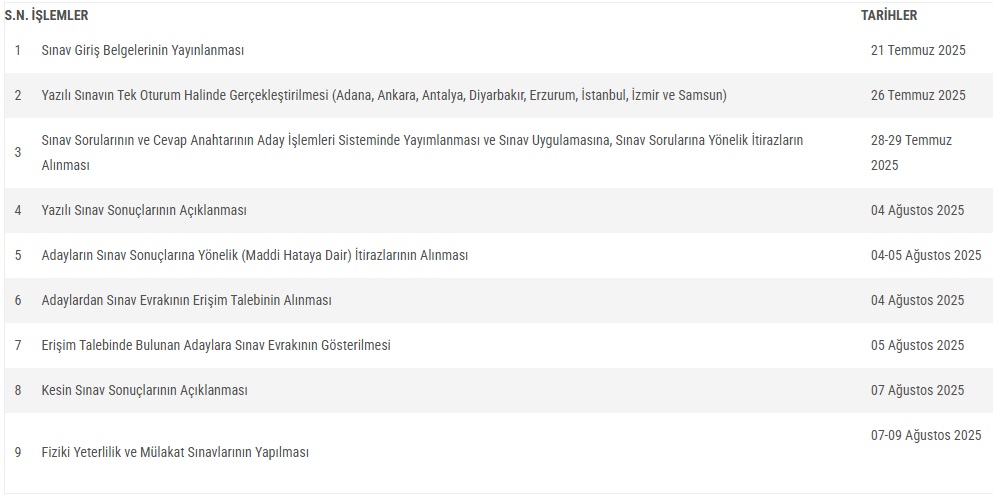 •Sınav, 26 Temmuz 2025 Cumartesi günü saat 14.00’te tek oturum halinde Adana, Ankara, Antalya, Diyarbakır, Erzurum, İstanbul (Avrupa), İzmir ve Samsun olmak üzere 8 (sekiz) sınav merkezinde yapılacaktır.